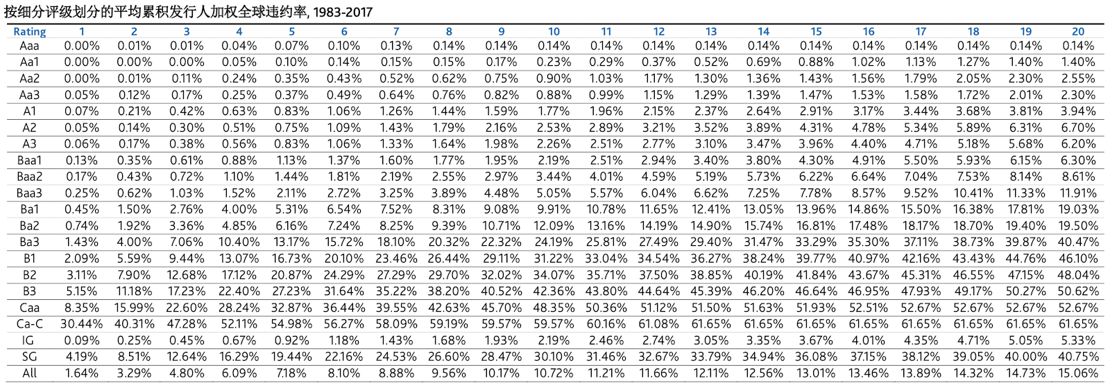 2. 標準普爾、穆迪各評等30多年來的平均違約機率表