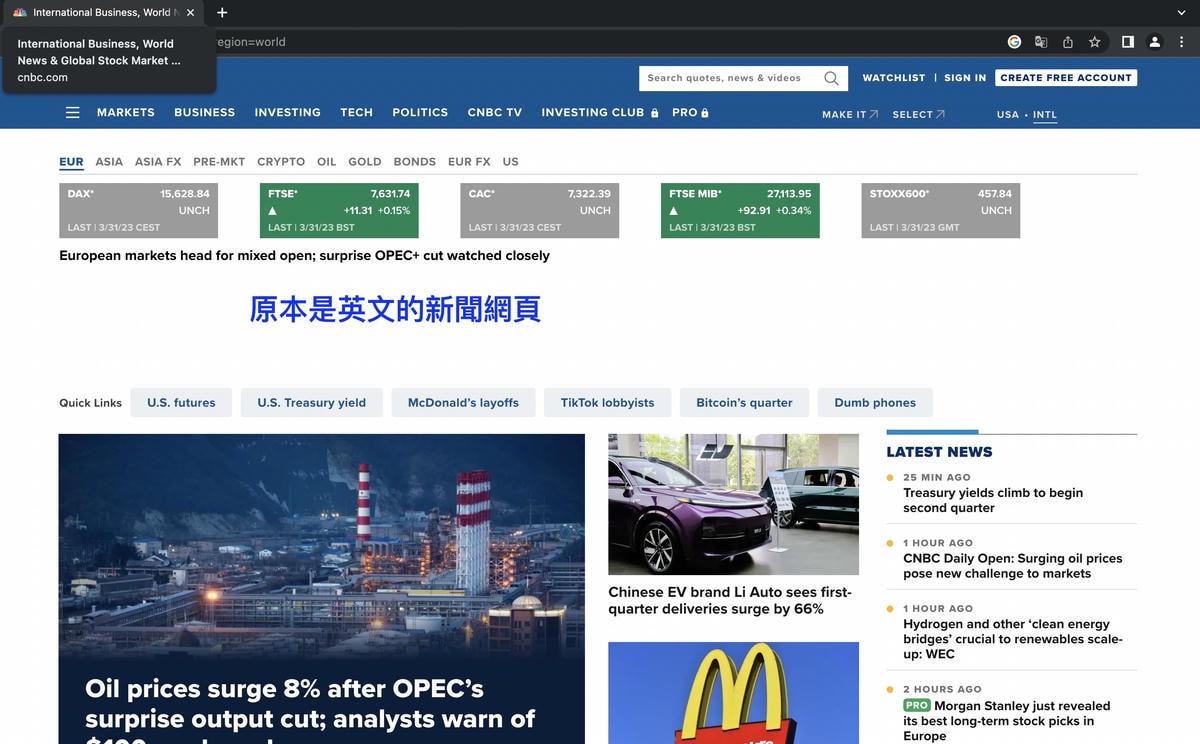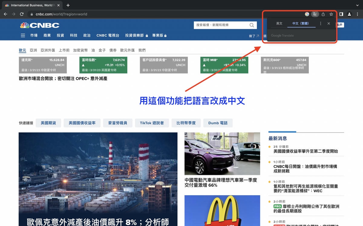 首先,需要下載google Chrome(下載連結在此)。下載並安裝完成後,用Chrome打開你想看的網頁,比方說英文新聞網站CNBC:
