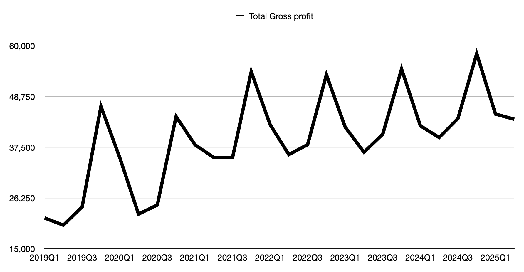 所以,最近蘋果的利潤成長主要是靠「服務」,而不是「產品」。下圖是蘋果從2019年第一季到2025年第二季的總毛利金額: