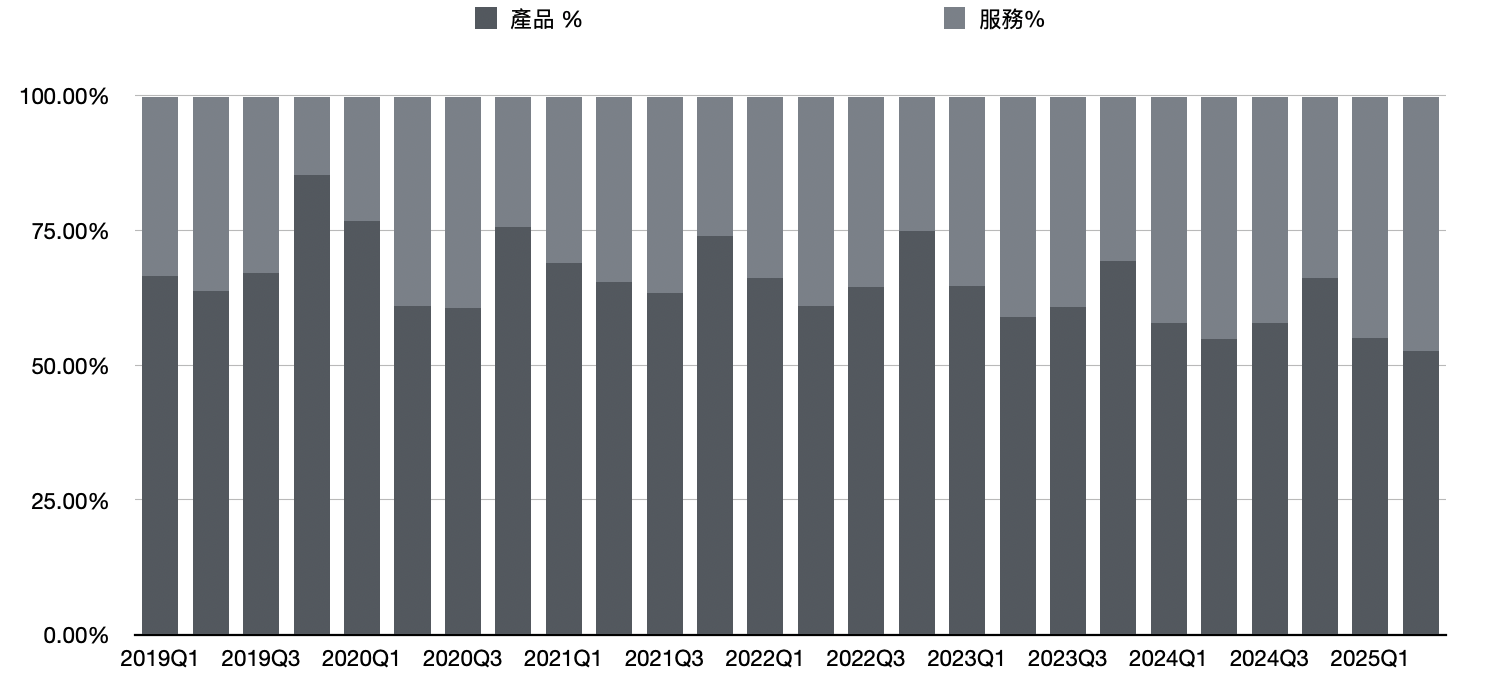 下圖是蘋果從2019年第一季到2025年第二季兩大業務的柱狀分佈圖: