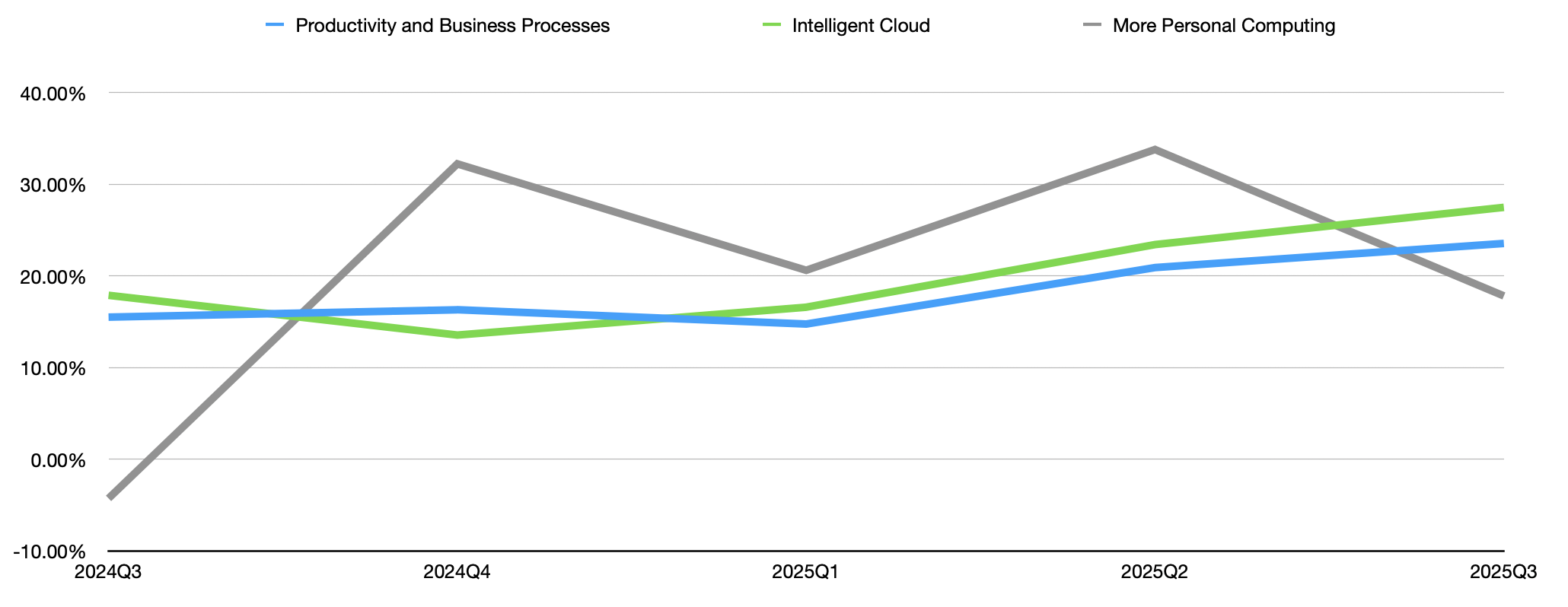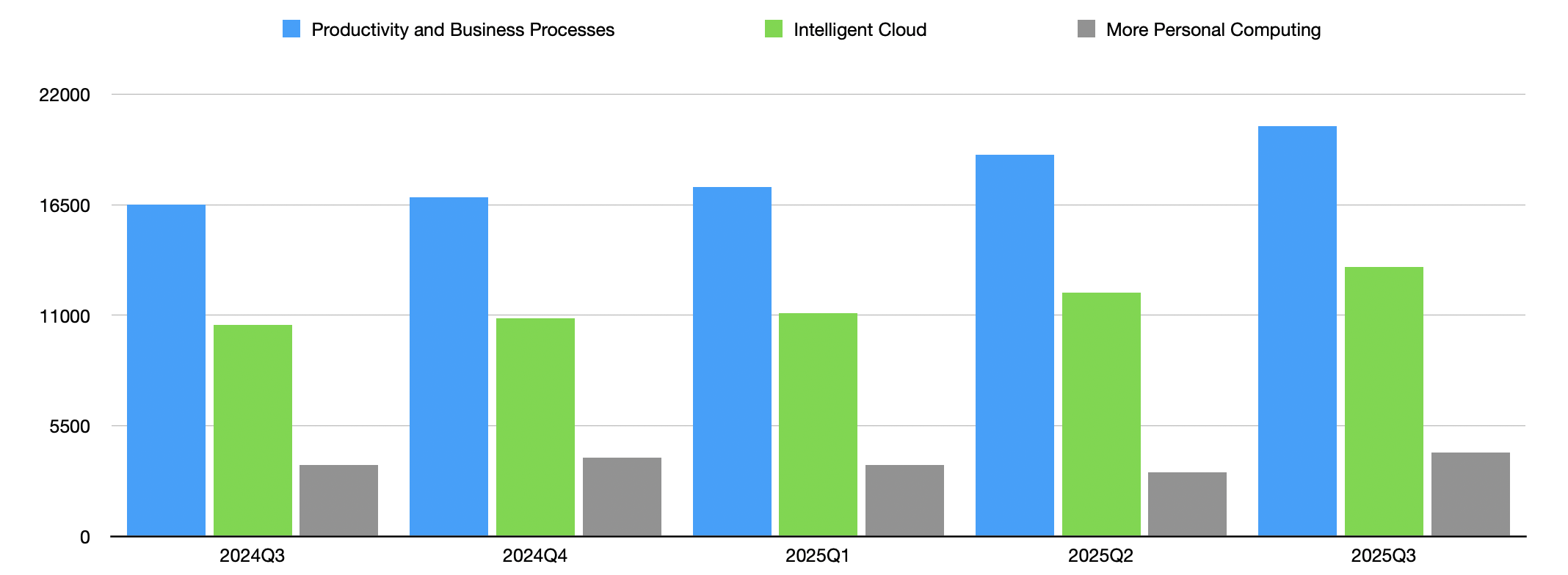 以賺錢比例來說,微軟主要靠「生產力及商業流程Productivity and Business Processes」賺錢,其次是「智慧雲Intelligent Cloud」。下圖是2024Q3~2025Q3的營業利潤分佈圖,因為2024Q3微軟有重新調整了營業項目的分類,所以Q3之前的數據會跟後期不一致,這邊就不放了: