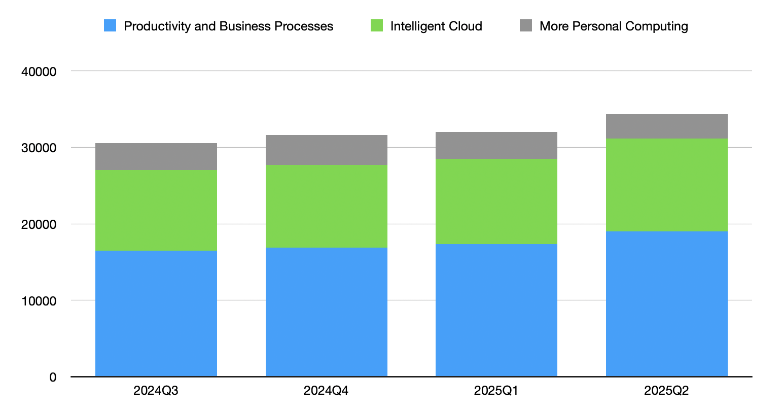 以賺錢比例來說,微軟主要靠「生產力及商業流程Productivity and Business Processes」賺錢,其次是「智慧雲Intelligent Cloud」。下圖是2024Q3~2025Q2的營業利潤分佈圖,因為2024Q3微軟有重新調整了營業項目的分類,所以Q3之前的數據會跟後期不一致,這邊就不放了: