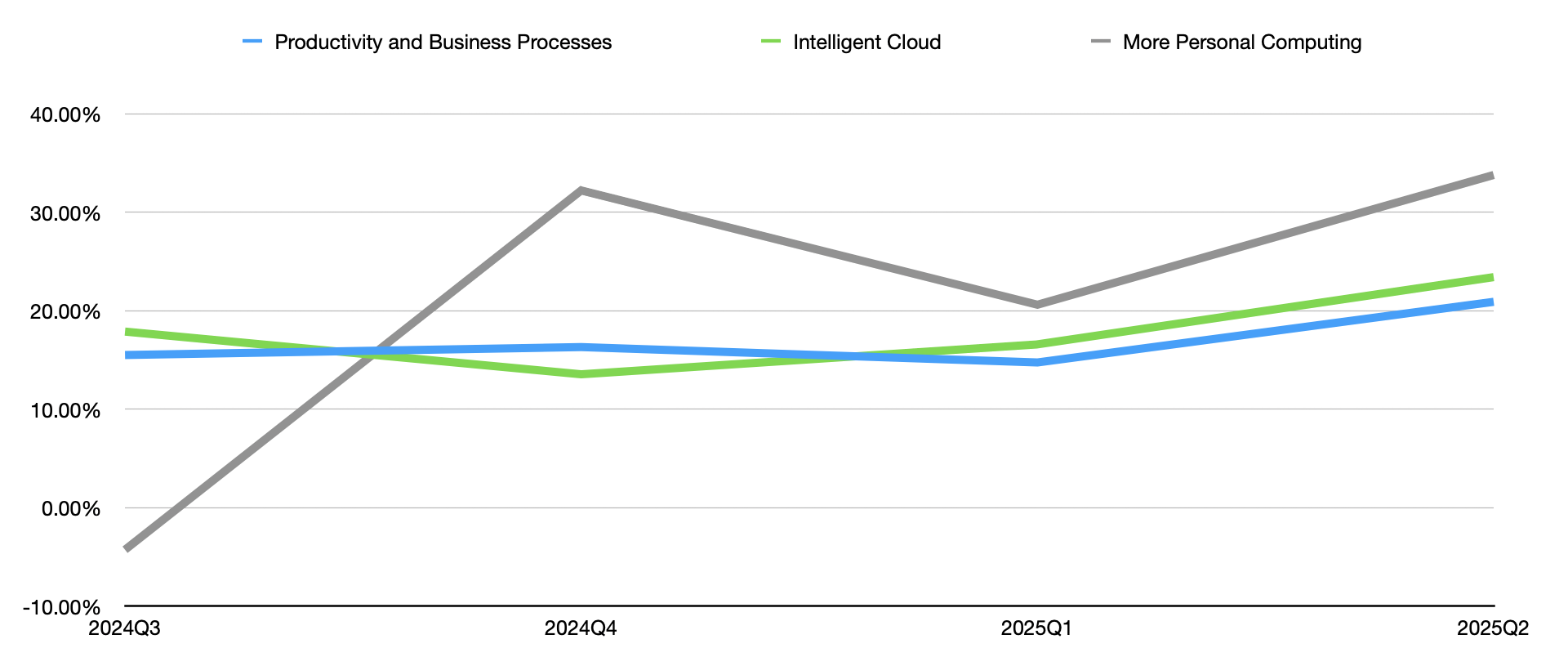 下圖是年成長率,雖然「個人處理More Personal Computing」成長率高,但它佔整體營業利潤的比重很低,所以實際貢獻不大;而另外兩塊則穩定成長: