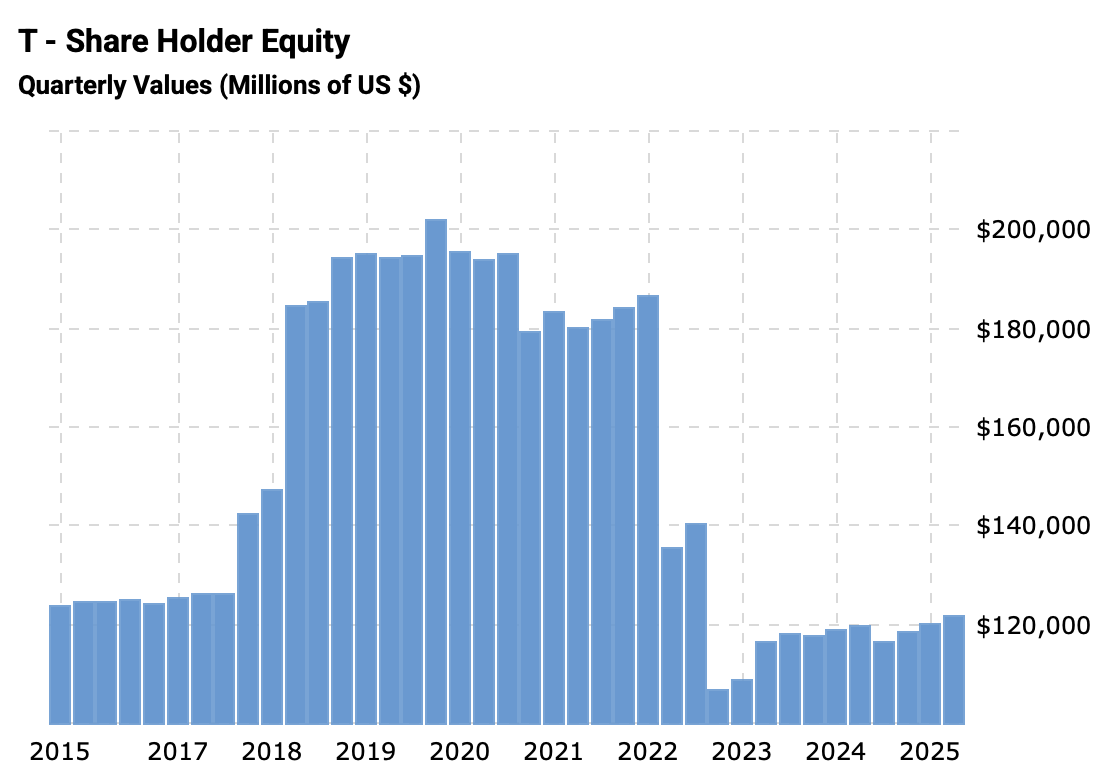 2023年因為負債佔股權的比例增加,商譽和無形資產又被減記了(AT&T真衰),資產總額再度降低,股權就又跌了一根,2023年初股權再創新低。不過,股票漲跌要看的不是誰考最高分,而是誰進步最多。AT&T從2022年賣掉華納後專心拼本業,股權逐漸爬升,最新一季2025Q2的財報,它的股權總值已經有1,213億美金了,雖然比買下華納前的1,470億美金還低,但看來是一路上升中,像2025Q2股權相比2024Q2的年成長率達1.71%;
