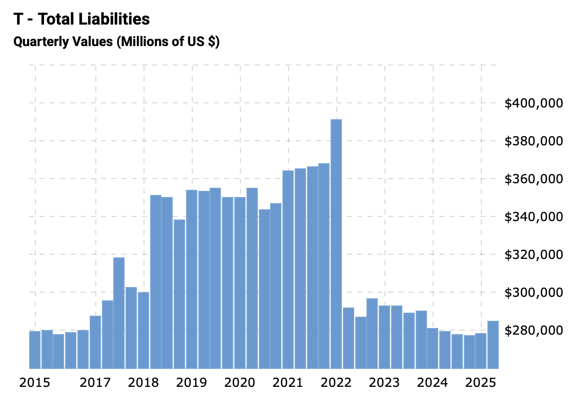 再來,AT&T的債務也逐漸減少。下圖是AT&T和Verizon的歷年總負債變化圖,可以看到,AT&T的總負債在2018年飆升,到2022年驟降,因為它併購華納後一併承接了華納的資產和負債,賣掉後也減記了華納的負債,所以總負債才會這麼暴增又驟降: