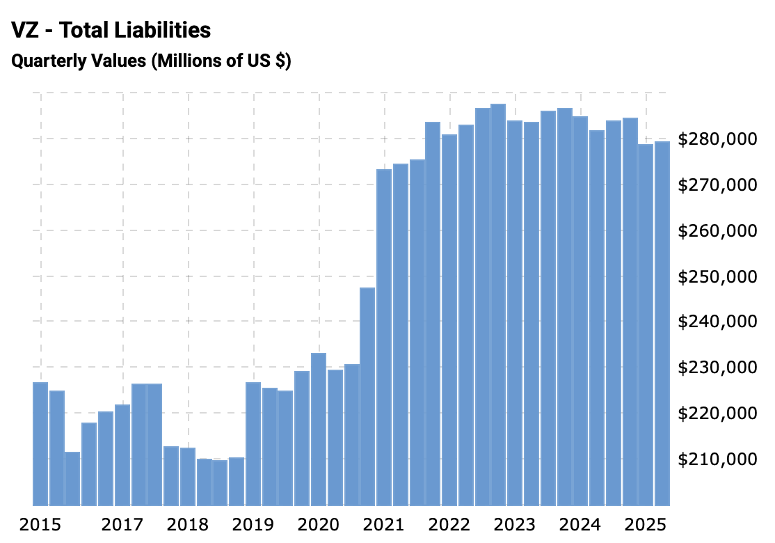 你說,不對啊,這樣看來Verizon負債大增不是更糟糕?至少AT&T的負債還減少?乍看柱狀圖是這樣,但我們要看右邊的數字。右邊數字的單位是百萬美金,Verizon在2024年底的負債是2,840億美金,AT&T卻是在2024年才努力把總負債壓到2800億美金以下。Verizon沒有亂買公司。所以乍看之下負債似乎逐漸上升,但上升了老半天也才跟AT&T努力瘦身後差不多,可見AT&T之前有多誇張。