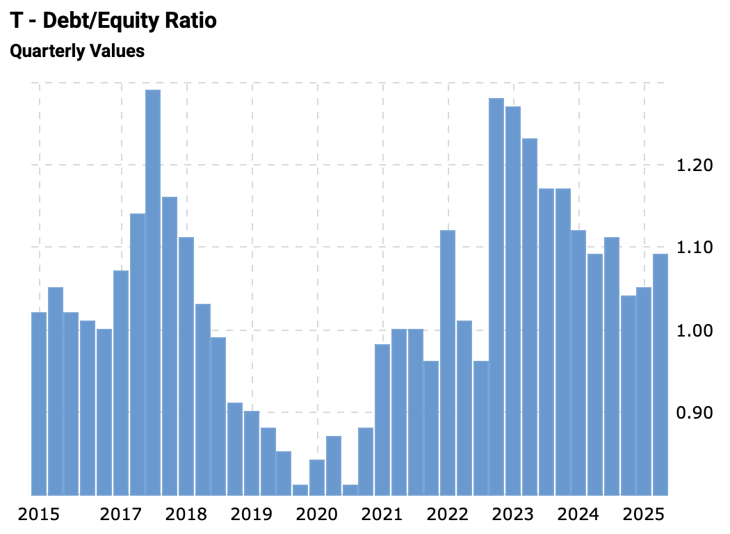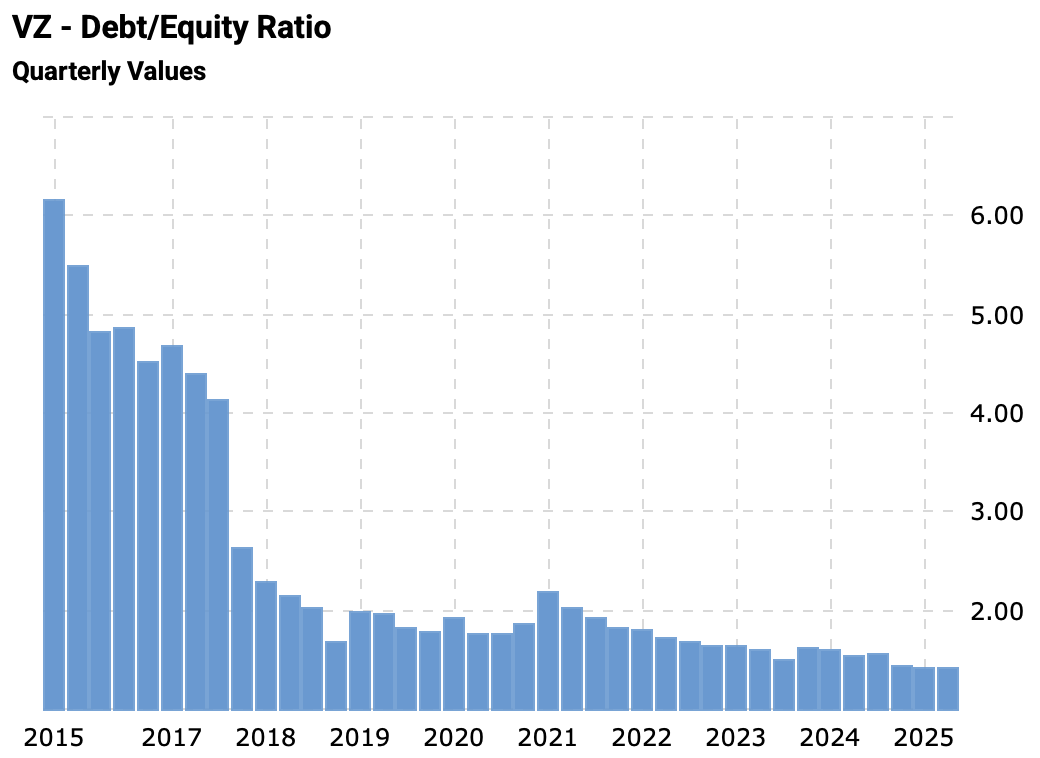 下圖是AT&T和Verizon近年的「債務/股權」比例,可以看到,AT&T債務佔股權的比重在2023年遽增(因為商譽等無形資產減記的關係),但2023年後這個比率卻一路降低,公司體質逐漸轉好;Verizon卻還好,沒有大增。
