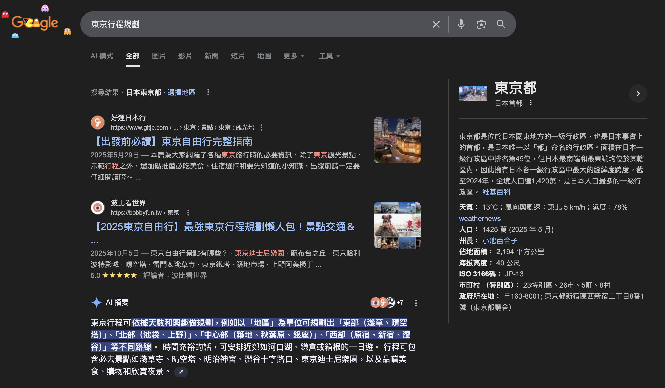 比方說我搜尋「東京行程規劃」,那跑出來的就是傳統的Google頁面,AI摘要排在下面。這一樣要搶SEO、一樣要下廣告,沒什麼變。旅遊業也是Google的廣告金主,Google不敢忽視: