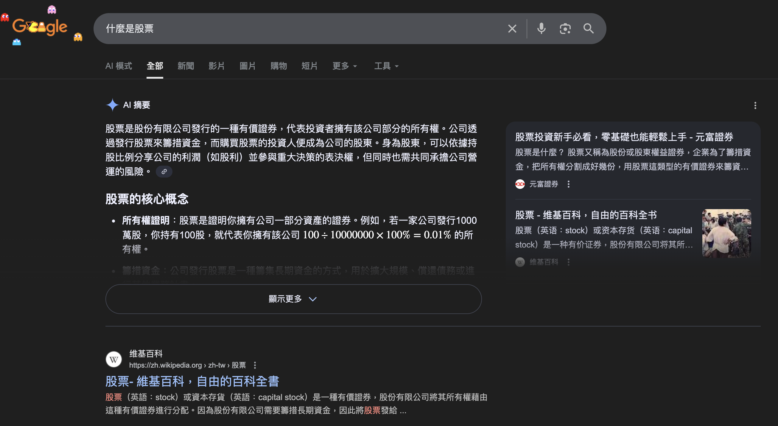 但如果搜尋「什麼是股票?」出來的就是AI摘要了。這些基本名詞解釋對Google來說沒有廣告價值(也就是低價值),Google就直接用AI整理給你。