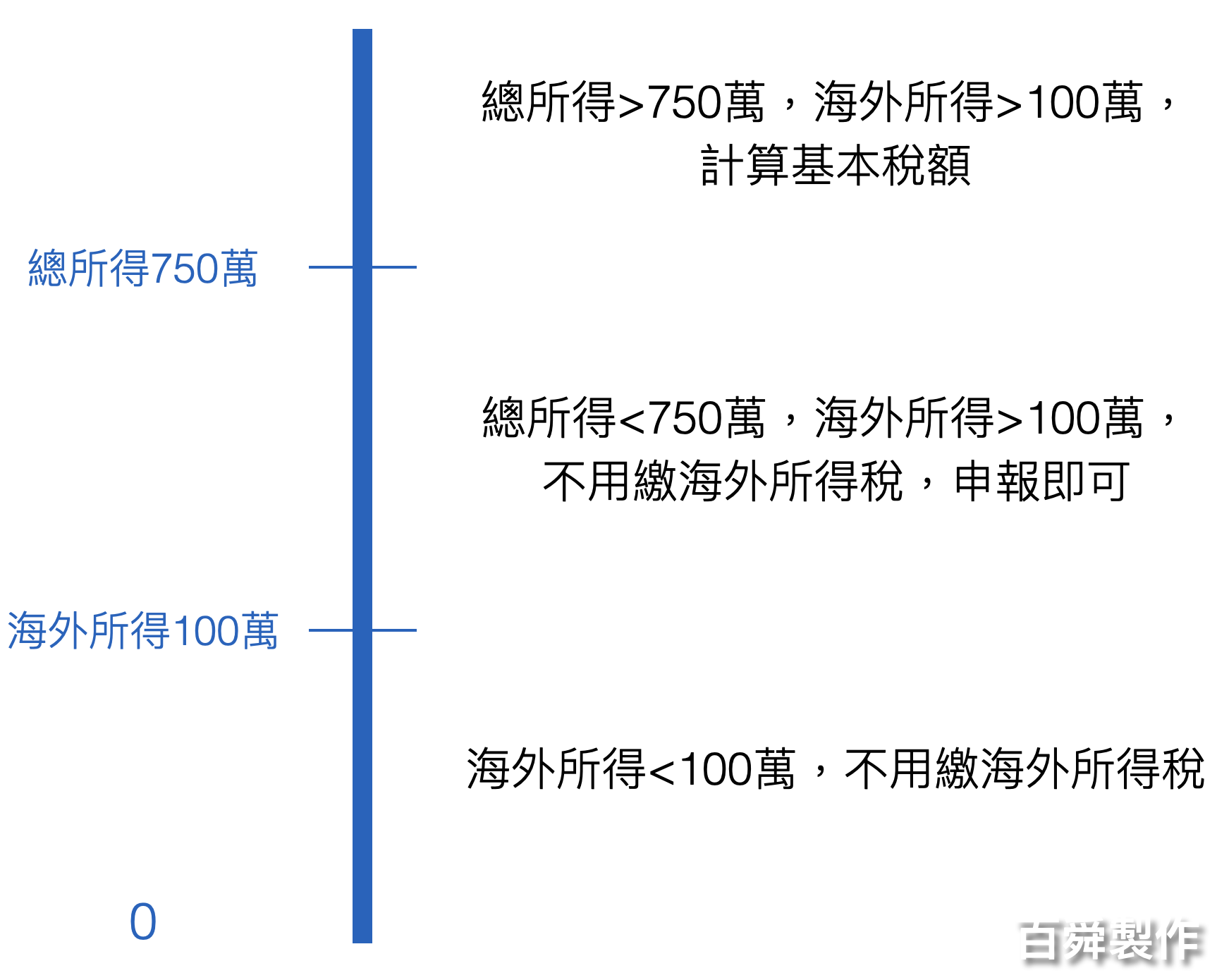 - 海外所得>100萬、總所得>750萬,且基本稅額 > 一般所得稅,要繳海外所得稅。