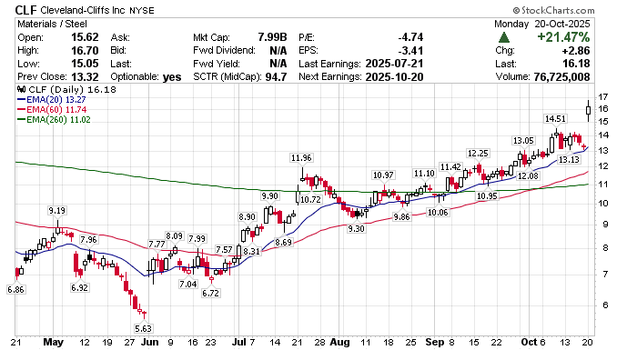 克里夫蘭鋼鐵(CLF.US)在10月20日的盤前公布財報,公布後大漲21.47%!從五月底到現在已漲了3倍。